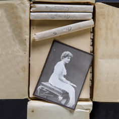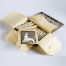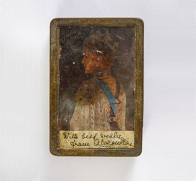 The example of the Alexandra’s Christmas Box in the museum’s possession is a yellow lacquered tinned steel box with a heavily damaged profile portrait of Queen Alexandra on its front. The tin contains 17 of the original 22 cigarettes, with each one having Alexandra’s signature printed on it. A photograph of Queen Alexandra, that were produced by William and Daniel Downey of Newcastle and London, would have also been included but it is missing from the museum’s example. However, the tin does contain a small photograph of Princess Mary, which would have been included in the Princess Mary Christmas box but somehow ended up in the Queen Alexandra version. It would suggest that the unknown original owner of the box must have also received the Princess Mary’s gift.