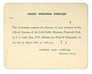 (Above) Invitation card from the opening of Cork Public Museum, 1945.