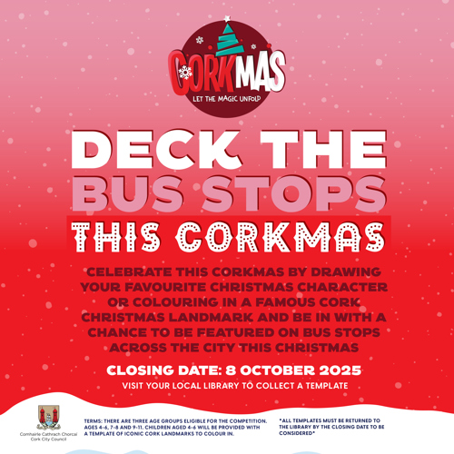 As part of CORKMAS, the celebration of Christmas in Cork, children aged from 4-11 are being encouraged to visit their local library to pick up a CORKMAS artwork sheet or draw their very own CORKMAS character. To be in with a chance of having their artwork featured in a Bus Shelter in the city, children must return their masterpieces to their local library before the closing date of October 8.