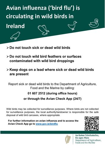 The public can and should report any sick or dead birds to the city council, or to the DAFM via the local regional veterinary office by using the Avian Check Wild Bird App https://aviancheck.apps.services.agriculture.gov.ie/, or by contacting the National Disease Emergency Hotline 01 492 8026 (outside office hours).