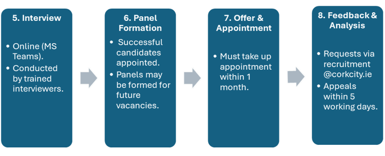 - Requests for feedback should be submitted in writing to recruitment@corkcity.ie. While there is no specific timeframe, every effort will be made to provide feedback as soon as possible.
