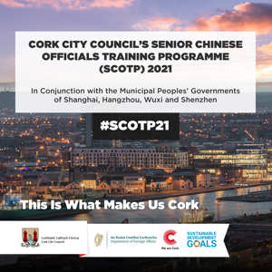 Cork City Council, with support from the Department of Foreign Affairs, is to run an innovative virtual Senior Chinese Officials Training Programme 2021 (#SCOTP21), an ambitious and wide-ranging celebration of Cork City’s friendship with our Sister City Shanghai and Partner Cities Hangzhou, Wuxi and Shenzhen