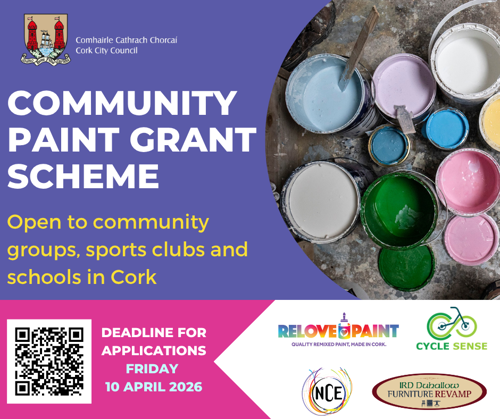 Cork County Council and Cork City Council have opened applications for the 2026 Relove Paint Community Paint Grant Scheme, which provides community groups, sports clubs and schools with up to 25 litres of recycled, high‑quality paint at no cost. The scheme, now in its fifth year, supported 166 groups last year, supplying more than 2,700 litres of upcycled paint across communities countywide.