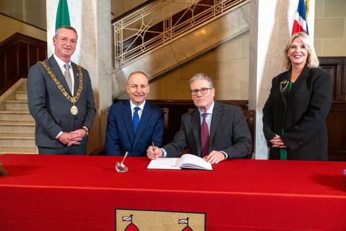 The Lord Mayor of Cork Cllr Fergal Dennehy, and the Chief Executive of Cork City Council, Valerie O’Sullivan, were delighted to welcome Taoiseach Micheál Martin and UK Prime Minister Keir Starmer to City Hall earlier this month for a special civic and cultural reception as part of the second annual UK-Ireland Summit.