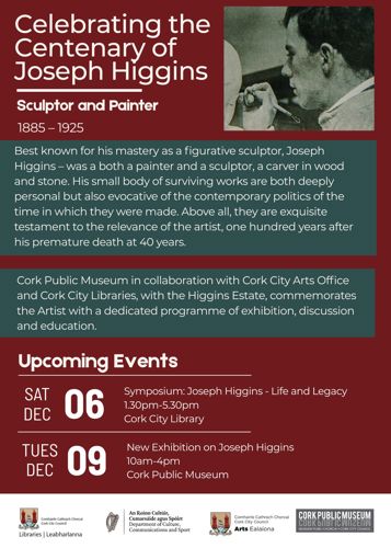 Cork City proudly marks the centenary of Joseph Higgins (1885–1925). Best known for his mastery as a figurative sculptor, Joseph Higgins was both a painter and a sculptor. His small body of surviving works are both deeply personal but also evocative of the contemporary politics of the time in which they were made. Above all, they are exquisite testament to the relevance of the artist, one hundred years after his premature death at 40 years.