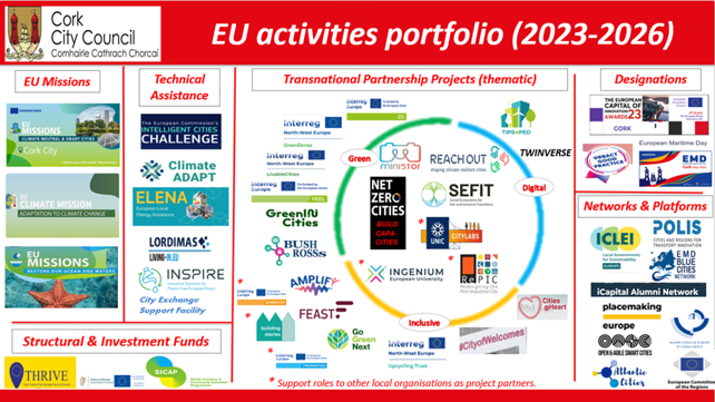 Since 2023 in particular, Cork City Council has achieved a notable track-record of over 30 project approvals as well as designations and awards at European level. At Q1 2026, there are 17 ongoing or newly-approved EU-assisted projects with frontline involvement from this organisation as a delivery partner. Additional and unfunded support roles are also being performed in several further projects, thereby enabling various other local and regional organisations to participate as full partners in their own right.
