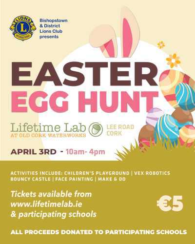 Magic shows, LEGO Building, Face Painting plus make and do are just some of the activities on offer on Friday April 3rd (Good Friday) for the Easter Egg Challenge to support Bishopstown Primary Schools. A fantastic family fun day out is guaranteed as children undertake a treasure hunt to solve clues on the way to finding a secret egg depot. The Easter Bunny has left an egg for everyone who completes the challenge and will bring friends to entertain on the day.